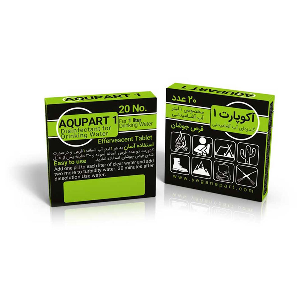 قرص ضد عفونی کننده آب یک لیتری آکو پارت Aqupart1 Disinfectant جهت ضدعفونی کردن یک لیتر آب استفاده میشود. قرص جوشان گندزدای آکوپارت با ماده موثره Nadcc ساخته می شود. Nadcc (دی کلروایزوسیانورات سدیم) یک مولکول آلی است که ۶۰% وزن آن را کلر تشکیل می دهد و در اثر حل شدن در آب تا ۷۲ ساعت میزان ماده موثره جهت ضدعفونی آب مورد نظر را تامین می کند.